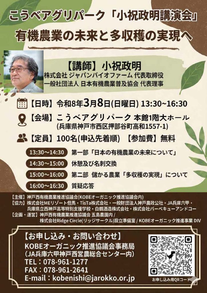 小祝政明 講演会「有機農業の未来と多収穫の実現へ」が開催されます。